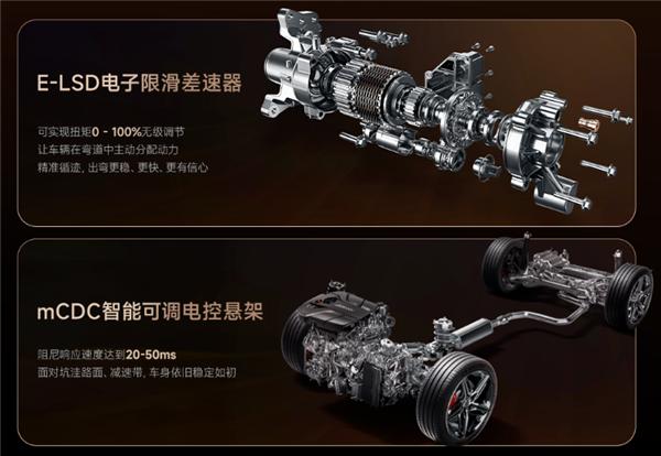 前者匹配7速湿式双离合变速箱,后者则使用9速手自一体,同时高配版本仍将提供mCDC智能可调电控悬架以及E-LSD电子限滑差速器、,强化操控感,提升驾驶乐趣。