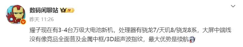 此外他还发文透露,某“耀子”厂内部现在有 3-4 台万级大电池新机。