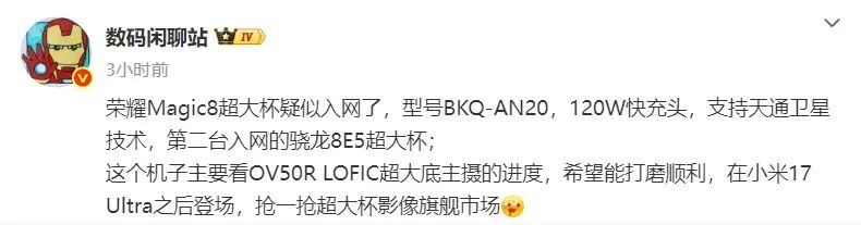 据博主@数码闲聊站 表示,这款新机疑似为荣耀 Magic8 超大杯,支持天通卫星技术,是第二台入网的骁龙 8E5 超大杯。