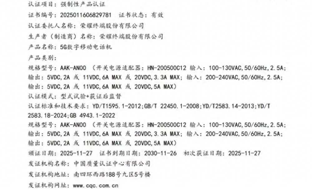 其他新机方面,一款型号为 BKQ-AN20 的荣耀新机通过 3C 认证,配有120W快充头,是一款“卫星移动终端(5G)”。