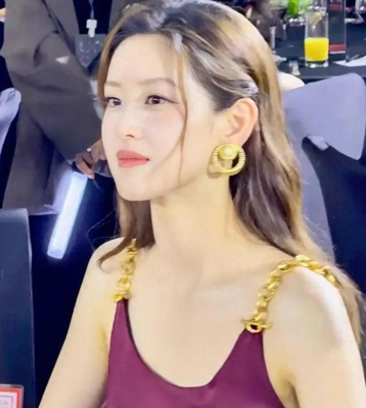 她穿香槟色吊带礼服配珍珠项链,与朱珠、曾梵志同框交流,笑容自信。