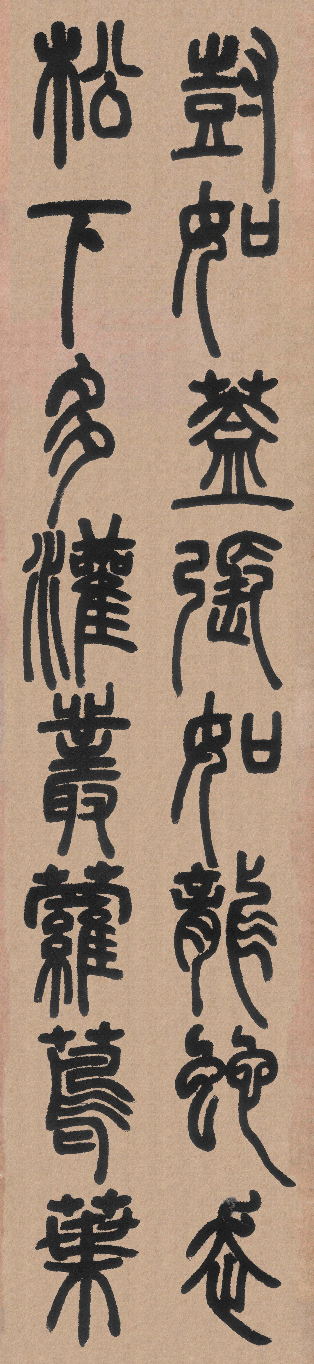 邓石如的篆书纵横开阖,字体略呈方形,与秦汉瓦当和汉碑额较为接近。邓石如以隶法作篆,成功突破千年来玉筯篆的束缚,极具创造性地将隶书笔法融入其中,果敢地运用长锋软毫,通过提按起伏,极大地丰富了篆书的用笔方式。