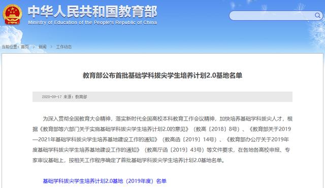 为深入贯彻全国教育大会精神,落实新时代全国高校本科教育工作会议精神,加快培养基础学科拔尖人才,根据教育部相关文件精神,在各地各高校申报、专家审议基础上,按相关工作程序确定了首批基础学科拔尖学生培养计划2.0基地名单。
