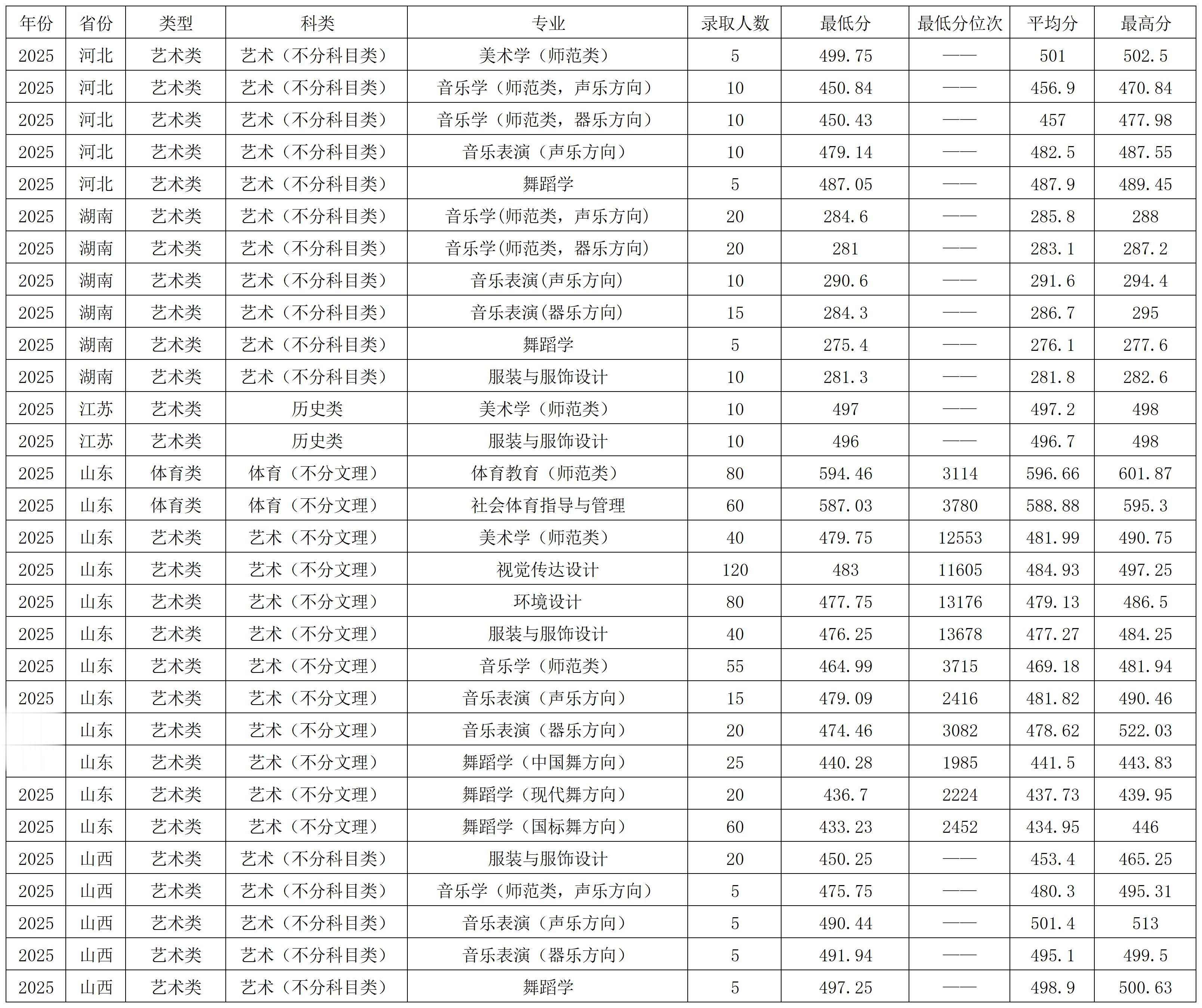 德州学院2025年艺术、体育类在各省各专业录取分数线