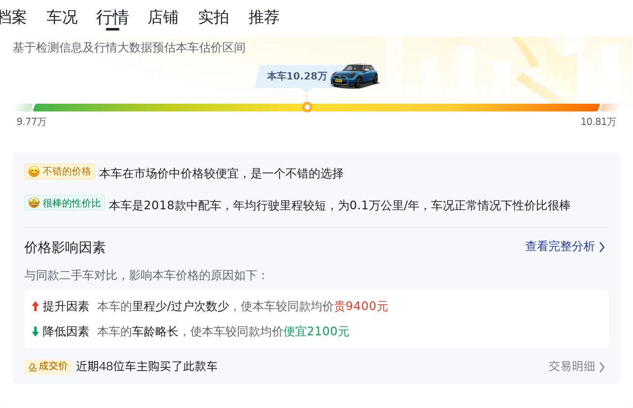 这辆车的具体版本是——2018款MINI 1.5T ONE五门版,2018年9月上牌,跑了8000公里,呼和浩特牌照,目前售价10.28万,未过户。