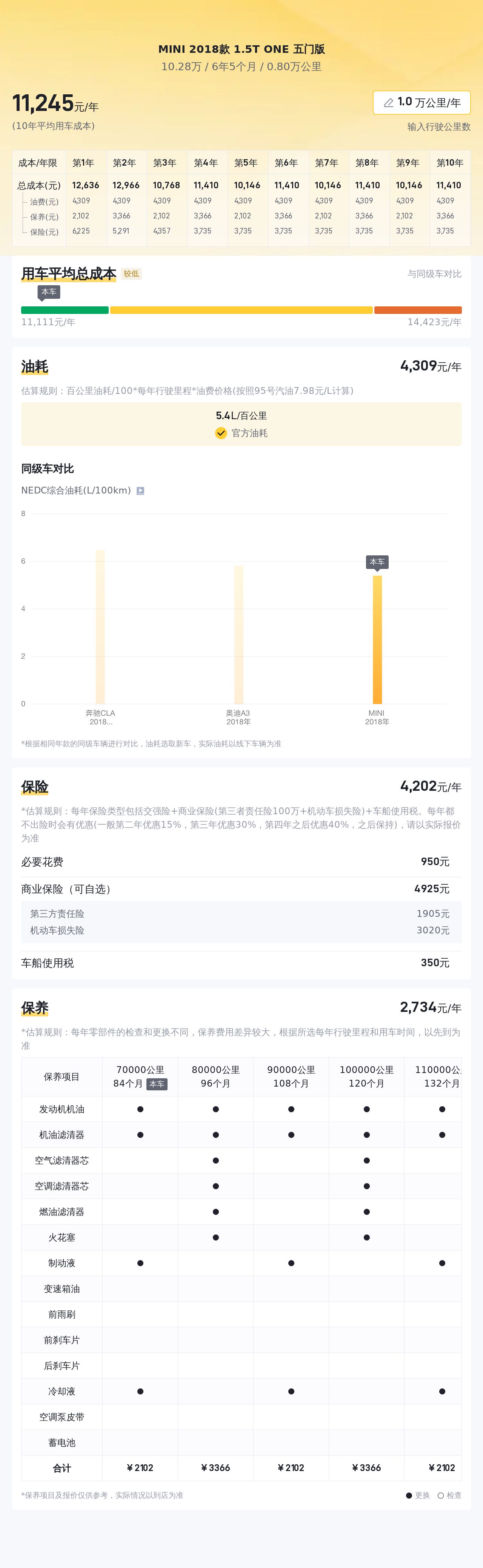 在用车成本部分,根据估算,这辆车年均综合用车成本大概在每年1.1万元左右。这项花销是跟车主的实际用车场景和使用强度有直接变化的。好了,以上就是为您总结的用车成本信息。
