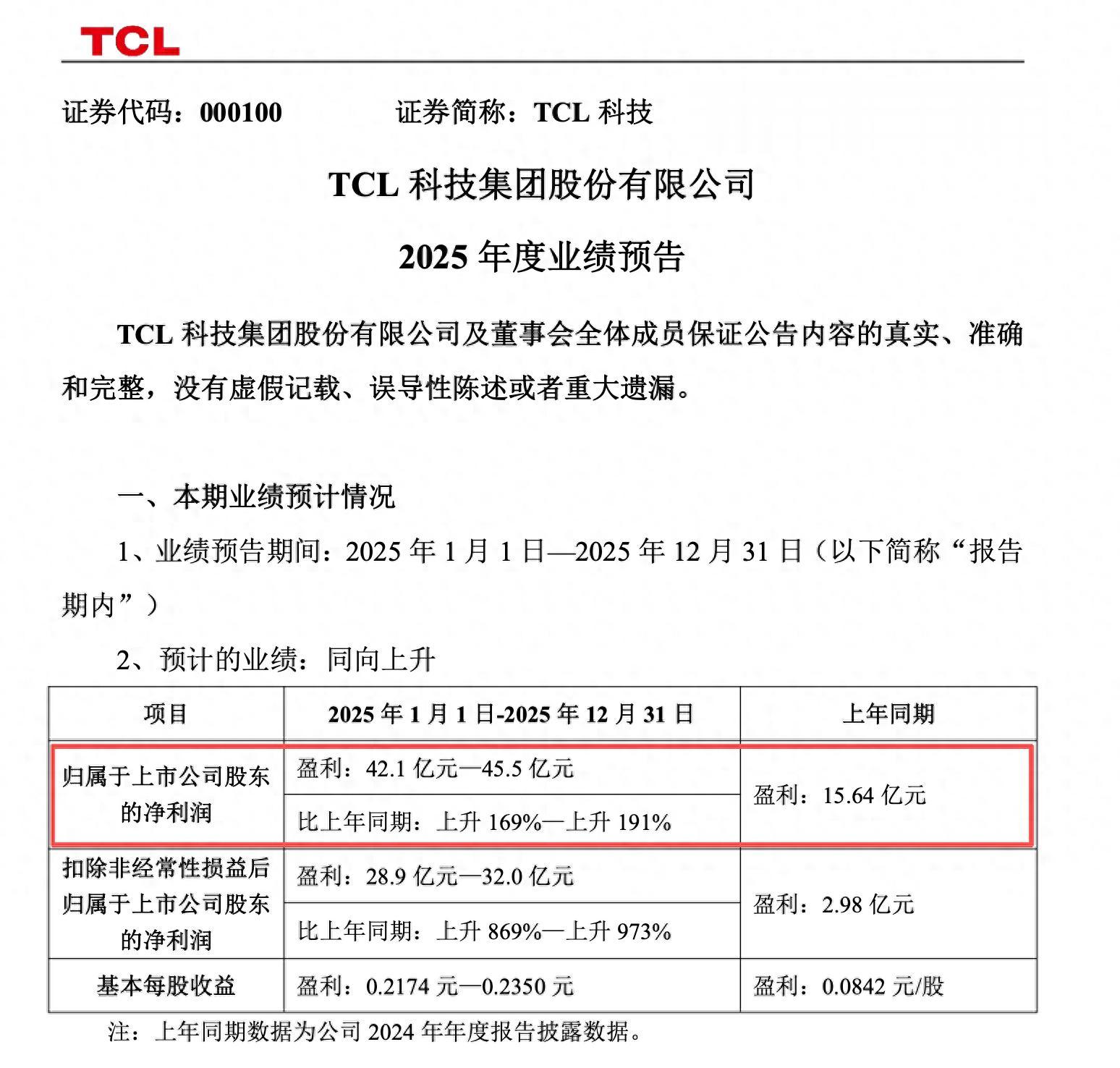 DoNews1月13日消息,1月13日晚间,TCL科技(000100.SZ)披露2025年度业绩预告,预计2025年归属于上市公司股东的净利润42.1-45.5亿元,同比上升169%-191%;扣除非经常性损益后归属于上市公司股东的净利润28.9-32.0亿元,同比上升869%-973%,盈利能力持续强化。