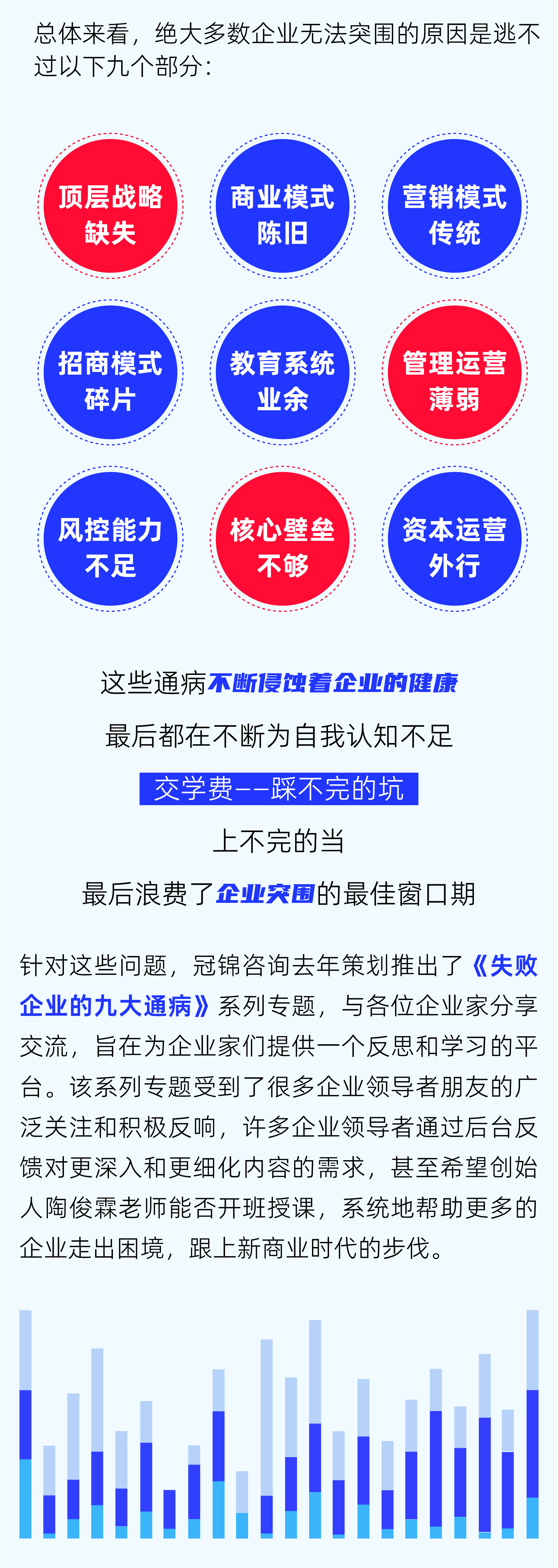 据统计,每年约有100万家企业倒闭,平均每分钟就有2家企业倒闭,存续五年的以上的企业不足7%,超过98%的创业企业最终都将走向死亡。回顾过去冠锦为大量企业和团队做管理咨询和陪跑辅导的经验来看,行业不一样,赛道不一样,基础不一样,规模不一样……总体来看,绝大多数企业无法突围的原因是逃不过以下九个部分:顶层战略缺失、商业模式陈旧、营销模式传统、招商模式碎片、教育系统业余、管理运营薄弱、风控能力不足、核心壁垒不够、资本运营外行,这些通病不断侵蚀着企业的健康,最后都在不断为自我认知不足交学费——踩不完的坑、上不完的当,最后浪费了企业突围的最佳窗口期。