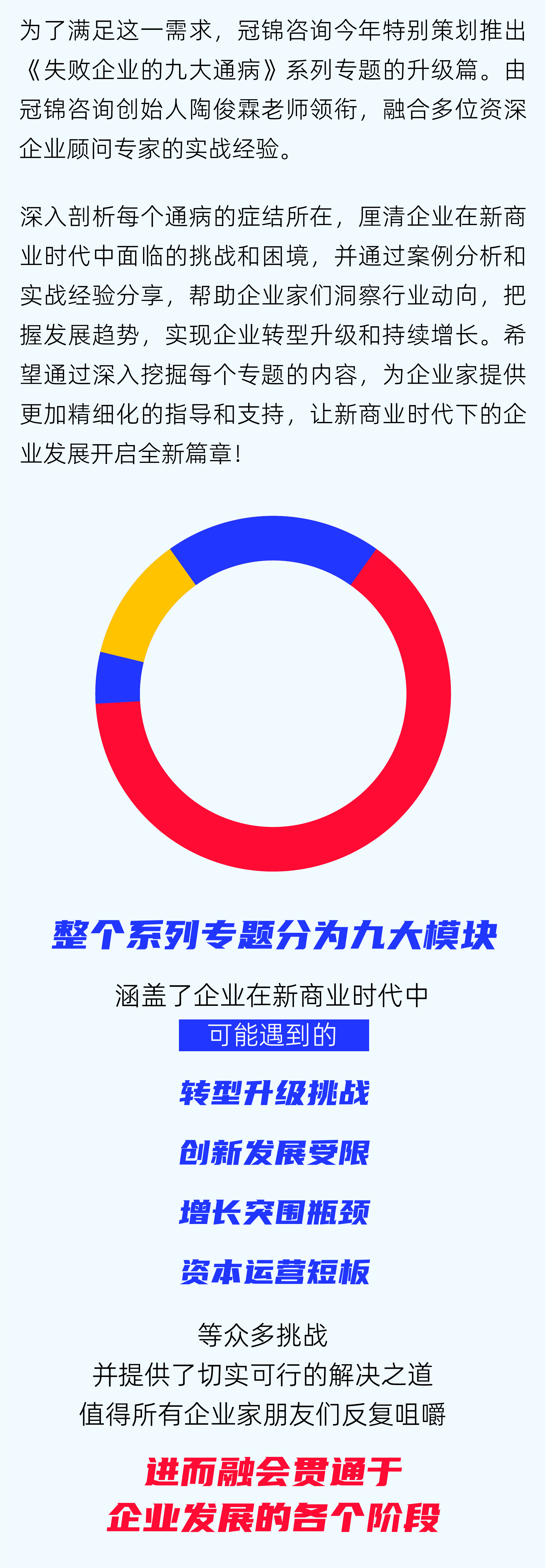 为了满足这一需求,冠锦咨询今年特别策划推出《失败企业的九大通病》系列专题的升级篇。由冠锦咨询创始人陶俊霖老师领衔,融合多位资深企业顾问专家的实战经验,深入剖析每个通病的症结所在,厘清企业在新商业时代中面临的挑战和困境,并通过案例分析和实战经验分享,帮助企业领导者洞察行业动向,把握发展趋势,实现企业转型升级和持续增长。希望通过深入挖掘每个专题的内容,为企业家提供更加精细化的指导和支持,让新商业时代下的企业发展开启全新篇章!