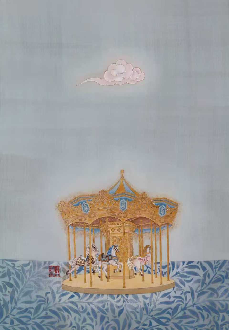 《童年的礼物》系列,是我用画笔和12岁女儿的童年告别礼。12年时光的陪伴,随着她告别12岁,我们也将渐行渐远,但是那些美好的记忆,我想留一些在画面里:游动的小鱼、飘飞的风筝、旋转的木马、可爱的玲娜贝儿……画面上每一处细节,都是她童年鲜活的一个片段,我想用画笔定格那些细碎的美好,讲述一个妈妈眼里温柔美好的童年。