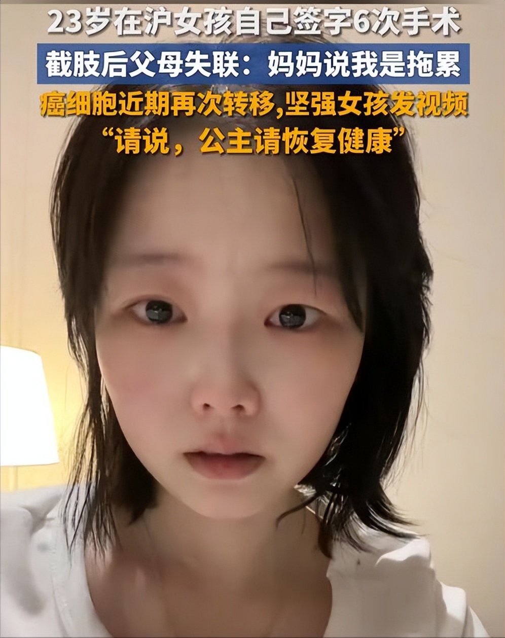 信息来源环球网《太心疼!23岁在沪女孩自己签字6次手术,截肢后父母失联:妈妈说我是拖累……上海专家全力救治》