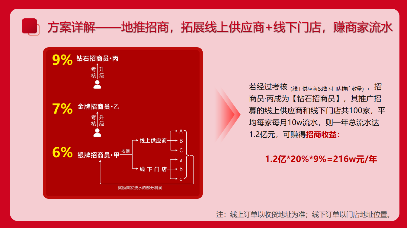 地推招商员的收入,全看层级有多高。银牌招商员推10家月流水10万的商家,一年能挣2.4万;金牌招商员推20家,一年能落9.6万;钻石招商员要是推100家,一年流水能到1.2亿,挣216万不在话下。分润规则写得明明白白,再也不用怕“累死累活推广,最后拿不到钱”的糟心事儿。