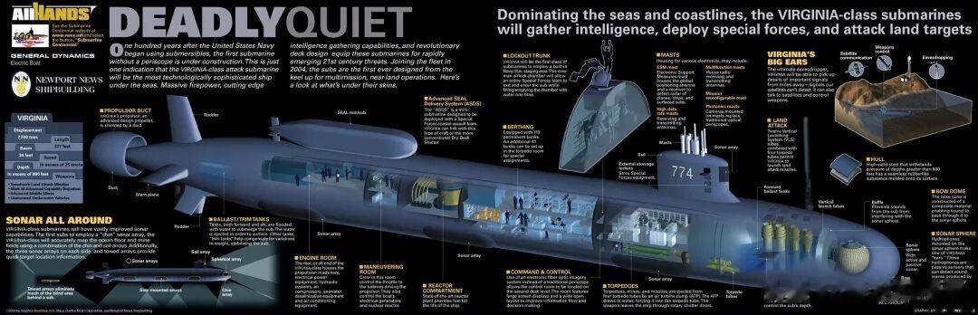 弗吉尼亚级采用单层外壳,排水量7900吨,长115米、宽10米,水上最高速度25节,潜行最高速度34节,预估最大潜深在500米左右。