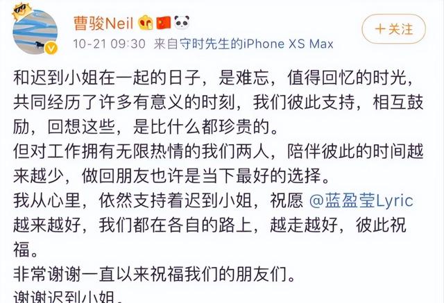 曹骏则表示:“陪伴彼此的时间越来越少,做回朋友也许是最好的选择。”