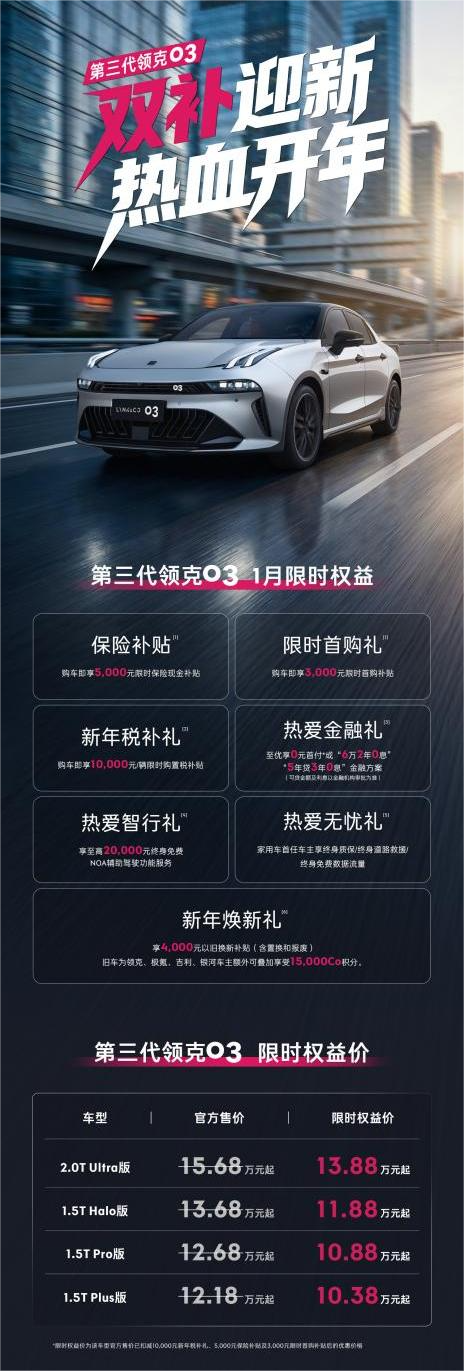 除了车辆性能与舒适配置,1月的购车权益是吸引消费者的核心亮点。第三代领克03在本月可享受新年税补1万元、保险补贴5000元及首购补贴3000元,总计1.8万元直减车款。金融方案方面,提供6万元两年0息、0元首付及5年贷3年0息等多种选择,满足不同预算需求。同时,车辆配套终身质保、终身道路救援及终身免费基础流量,后期使用成本可控。若选购2.0T Ultra版本,还可零元享受终身免费NOA辅助驾驶权益,进一步提升质价比。政策有效期至1月31日,确保春节前提车用户充分享受优惠。