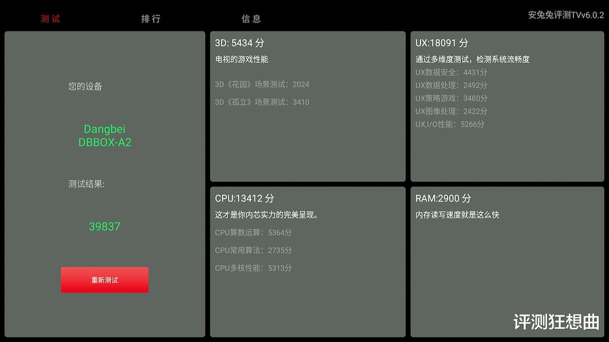 为了更直观地验证当贝H5的性能,我使用安兔兔TV版 对其进行跑分测试。最终得分在4万分左右(不同批次或固件版本可能略有差异)。在入门级电视盒子中,这个成绩处于中规中矩的水平,足以保证系统日常操作和流媒体播放的流畅性。