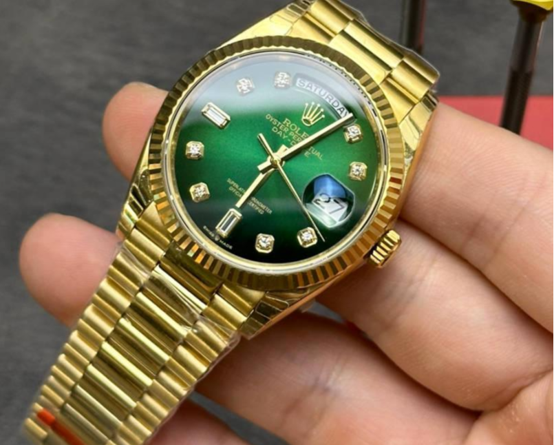 劳力士星期日历金表,俗称DD。是很多政商精英名流的宠儿。特别是型号128238烟熏绿36毫米款式,更是经典中的经典,渐变绿色在黄金的映衬下,显得格外耀眼。