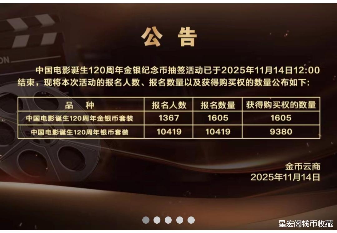 中国电影诞生120周年金银纪念币预约抽签结束以后,从参与人数情况来看,也是突破了1万人大关,最终参与人数定格在10,419人,可抽签数量9380套,中签率为90.03%。中国电影诞生120周年金银套装参与人数其实也并不是太多,在金银纪念币预约抽签当中,也算是参与人数少的品种之一。最终中国电影诞生120周年金银套装参与人数也只有1367人报名参与,报名套数1065套,可抽签数量1065套,中签率100%。