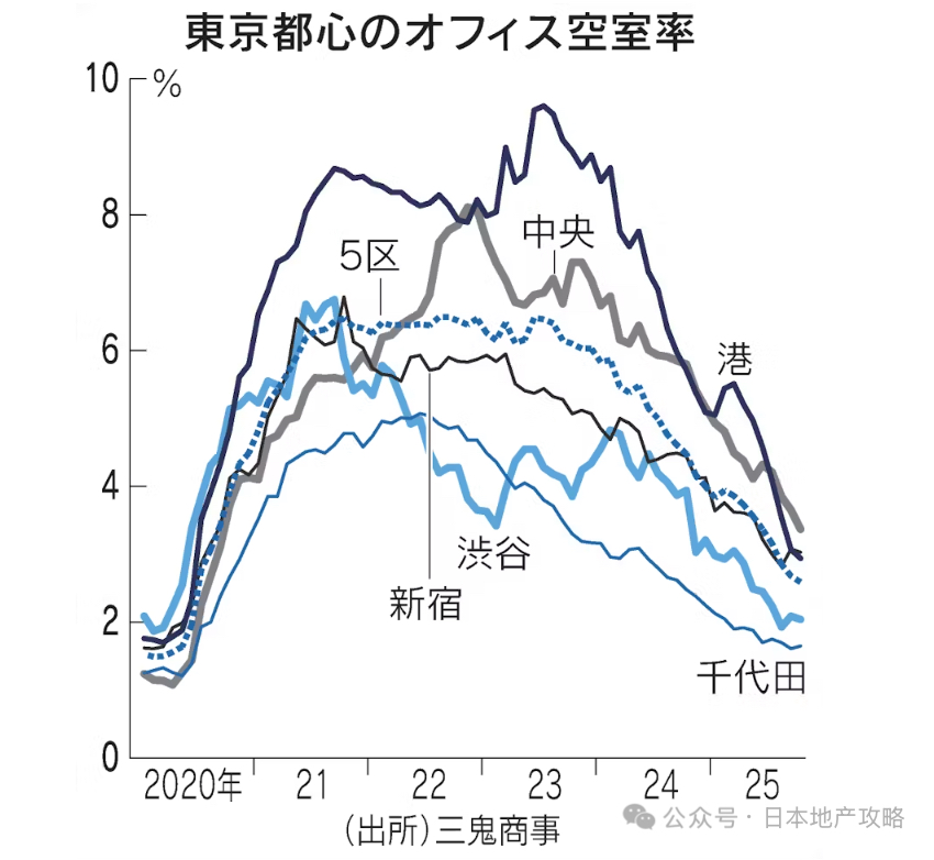 从空置率来看,东京核心区已进入“低空置时代”。2025年10月,五大核心区空置率仅2.6%,较2024年同期下降1.93个百分点,连续7个月低于5%的平衡线;其中千代田区空置率最低,仅1.05%,港区、新宿区空置率也低于3%。更关键的是,空置面积还在持续减少——2025年9月,东京商务区单月空置面积减少1.4万坪(约4.6万平方米),不少楼宇的空置空间在未公开招租前,就被原有租户通过“内部扩张”抢占。