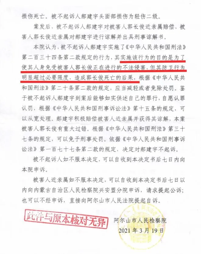 2021年3月,阿尔山检察院作出《不起诉决定书》,认定郝建宇之行为属于“防卫过当”;鉴于积极赔偿、死者家属谅解、被害人有重大过错等,对郝建宇不起诉。