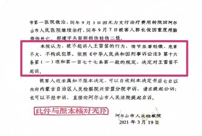 同时,王雷笛亦因“情节显著轻微、危害不大”,被检方认定为“不构成犯罪”,不予起诉。