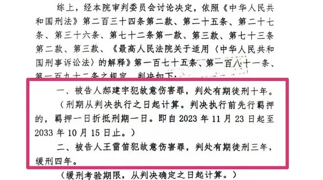 2024年4月3日,阿尔山法院一审以“故意伤害罪”判处郝建宇刑期10年;王雷笛则被判三缓四,并赔偿死者家属6万余元。