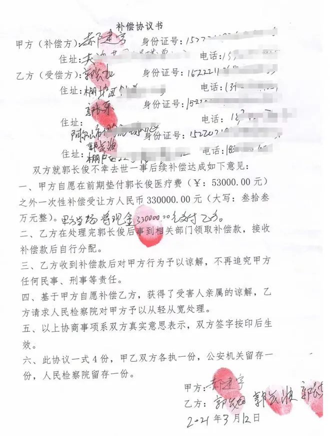 2021年3月12日,郝建宇一家筹集了38万余元,赔偿给死者的三个哥哥。死者家属出具了谅解书,表示不追究郝建宇任何法律责任。