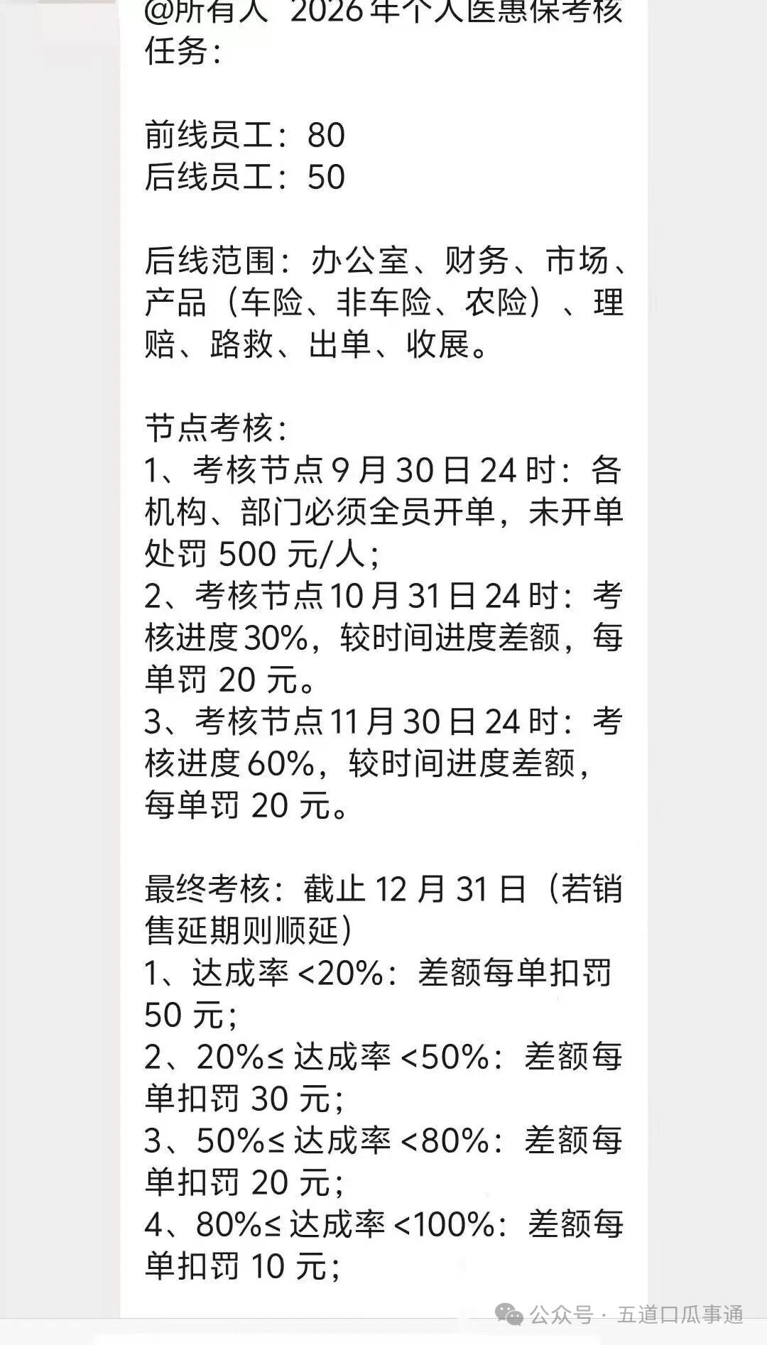 收到小伙伴投稿:某保险公司的高额任务,对未开单员工处罚500元/人。对非收展渠道未达到活动量要求的打卡次数和拜访次数,收