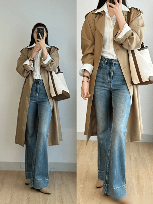 下装的选择同样影响着整体造型。为了保持长风衣流畅的线条感,下装应尽量选择简洁利落的款式。例如,高腰直筒裤或简单的A字裙都是不错的选择。这些下装不仅能与长风衣形成良好的视觉衔接,还能有效避免过于复杂的搭配造成杂乱感。
