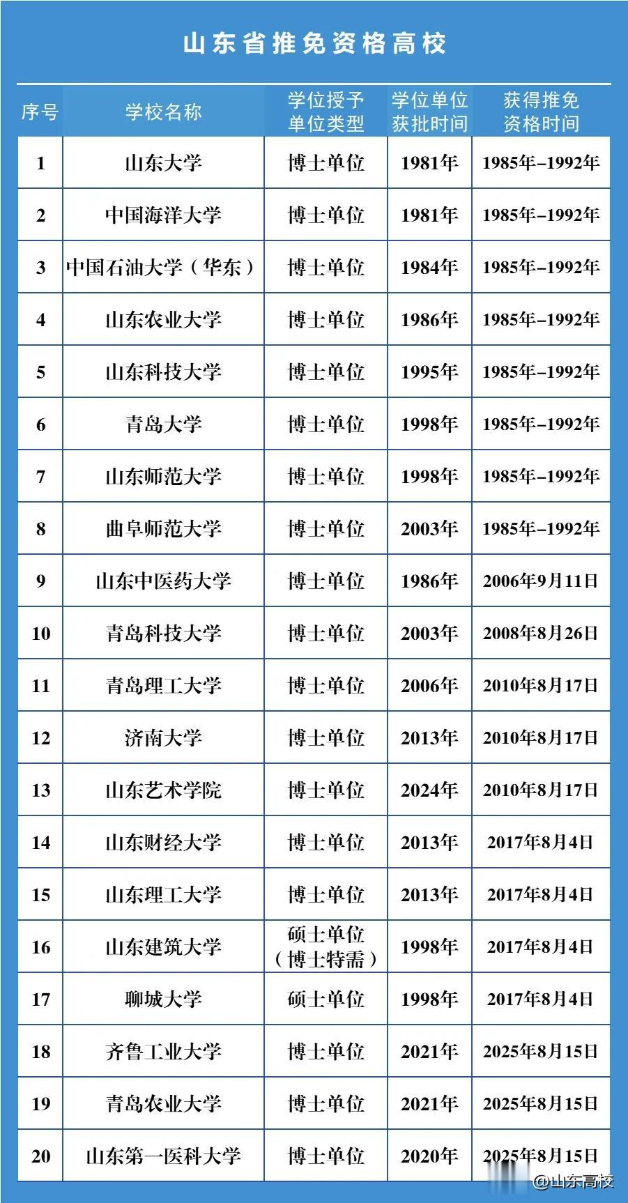至此,山东省推免资格高校达到20所,名单如下: