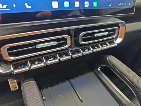 内饰设计延续硬派风格的同时兼顾了舒适性:仪表台与门板采用硬线条勾勒,中控区域的皮质触感偏细腻,按压后回弹较快,没有明显塌陷感;门板上沿的软质包裹高度刚好贴合手肘,长途倚靠不会硌得慌。细节处的镀铬装饰带有轻微磨砂质感,用手触摸无指纹残留,恰到好处地缓解了硬派风格的沉闷,这种“硬柔结合”的取向更贴合家用场景——一家人乘车,舒服耐看、不易产生审美疲劳才是核心需求,无需多余华而不实的设计。