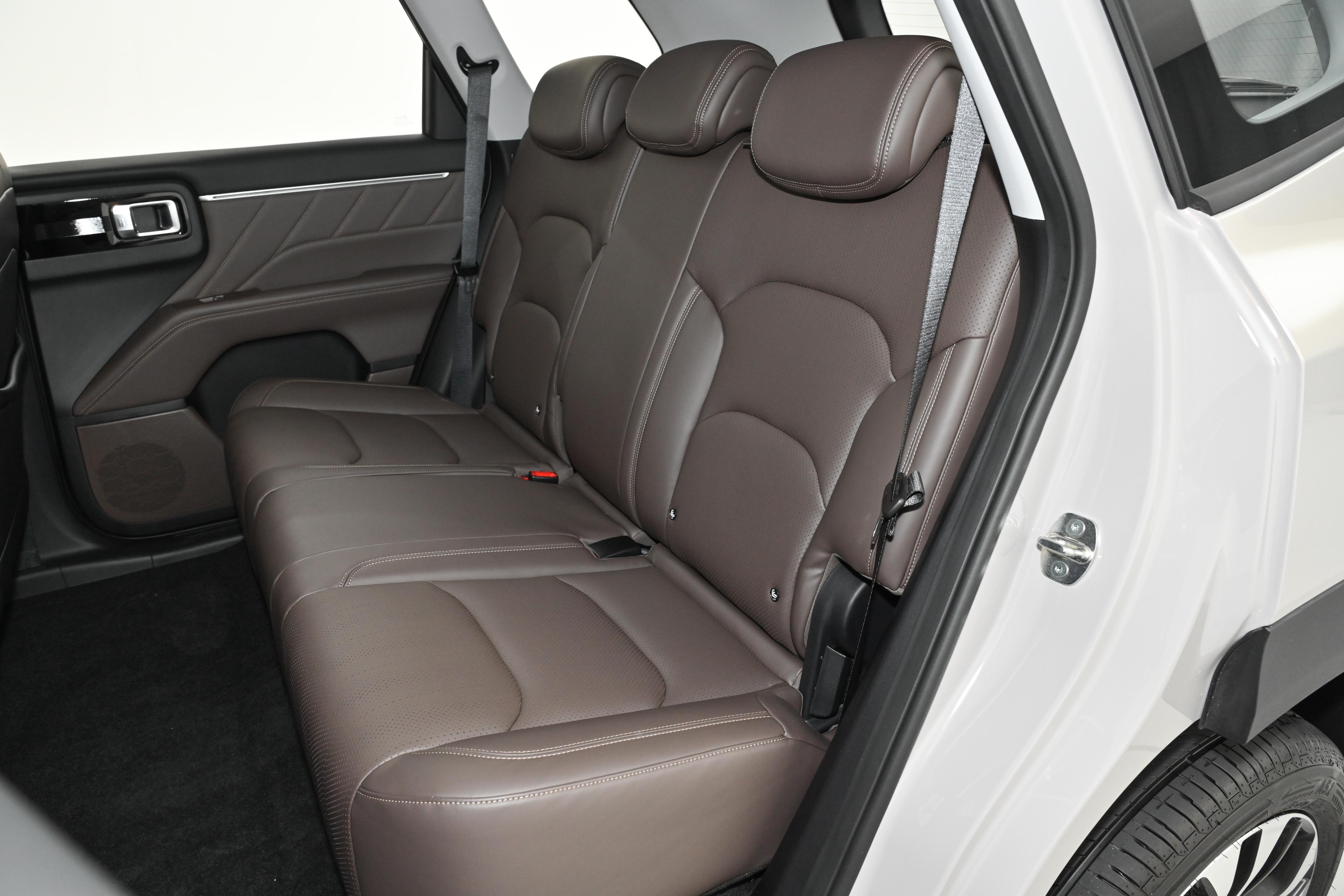 后排是家庭使用的核心场景,170cm 乘客落座后,腿部距前排座椅靠背仍有两拳多空间,翘腿放松毫无压力;头部空间同样充裕,不会有压抑感。中间座椅平整性良好,临时乘坐时脚部摆放舒适,全家三人同行时,后排乘客均可获得舒展坐姿。