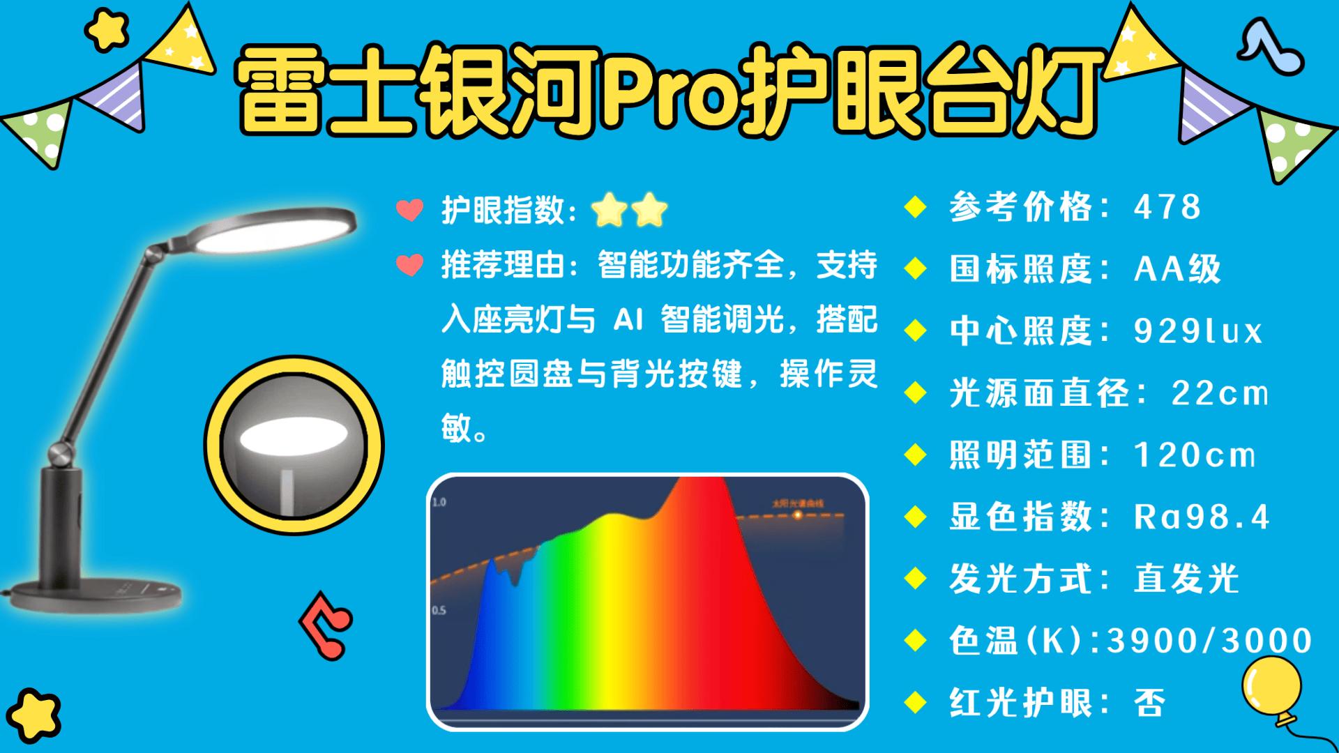 孩子护眼灯什么品牌好?雷士银河Pro台灯采用220毫米圆灯透直径设计,搭载133颗灯珠,实现929lux的照度,达到国AA级标准。,色温调节范围为3200K-5000K,整体来说可以满足日常使用需求。