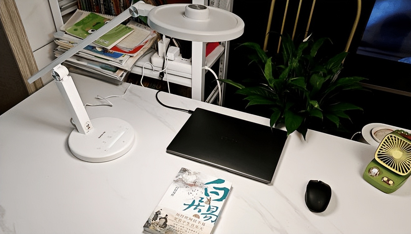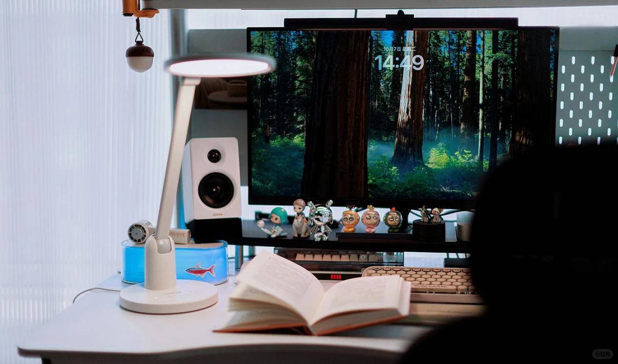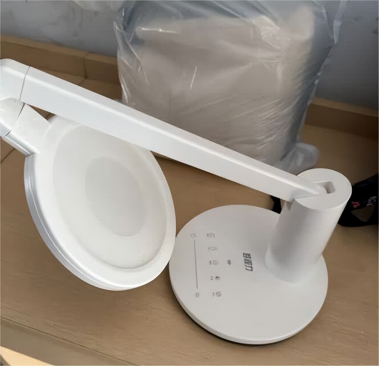 使用体验:灯头直径14cm,覆盖约一米桌面,能满足日常使用。纯白简约配色,造型小巧,适配各类桌面环境。