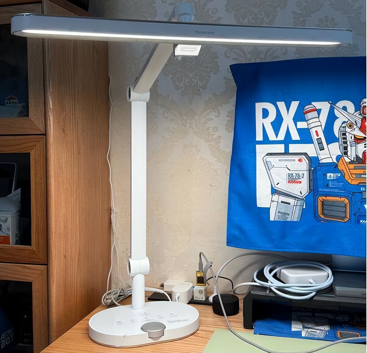 孩子护眼灯什么品牌好?霍尼韦尔X5护眼台灯它的灯头长达55厘米,搭配近50厘米的灯臂,铺开的光线能均匀覆盖约1.2米的桌面区域。相比常见的短灯头台灯,X5在双人书桌或宽幅办公台上的优势尤为明显,左右两侧亮度衰减被显著降低,整个照明区域的均匀度表现更好。