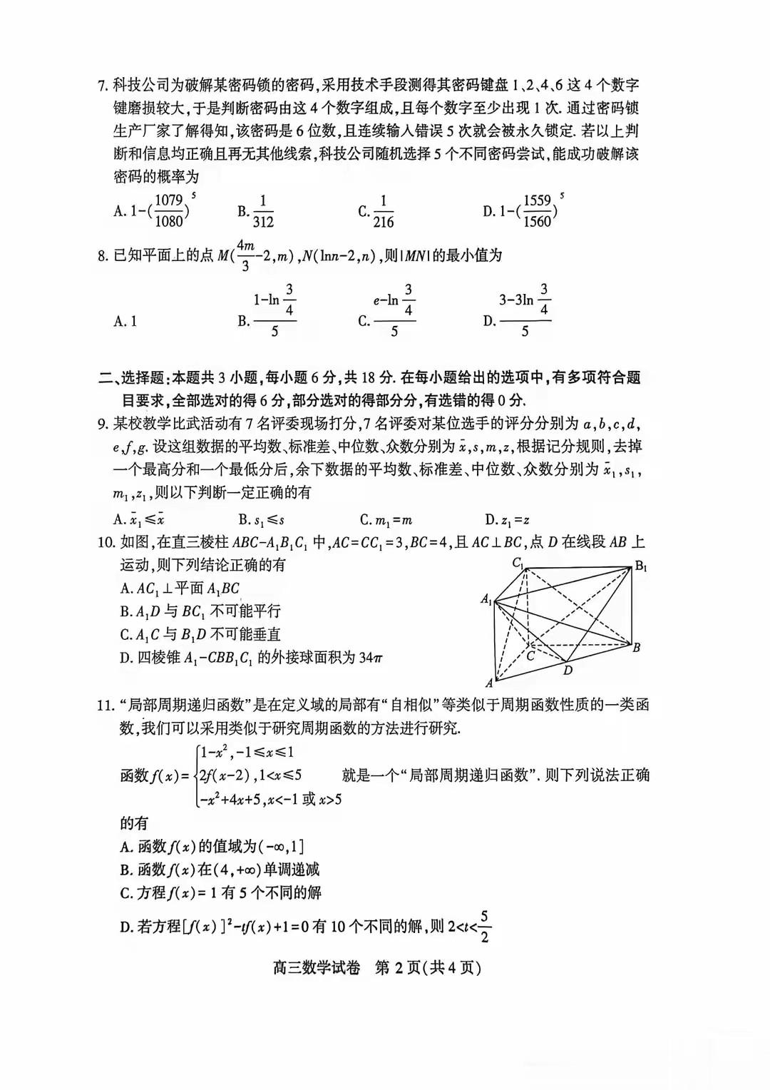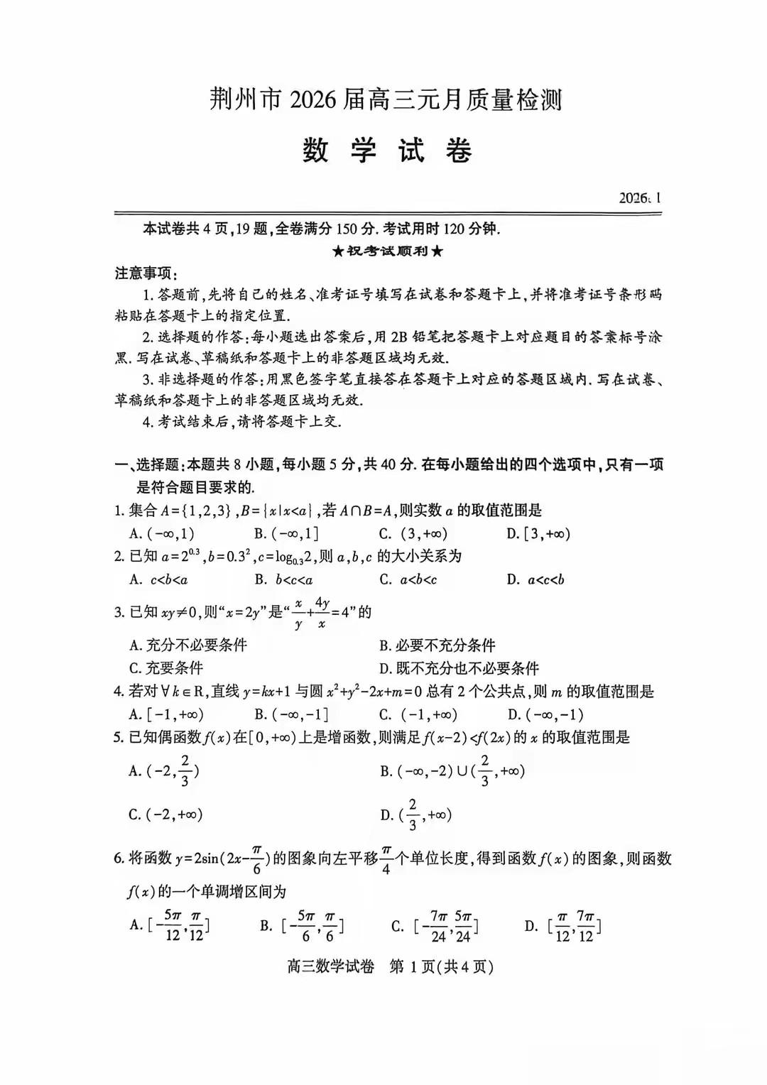 荆州市2026届高三元月质量检测试卷出炉,考试包括选择题、填空题和解答题。