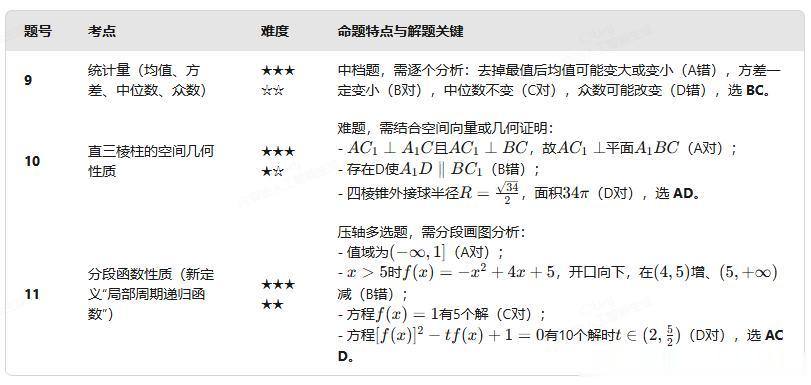 高频考点突出:函数导数(8、19)、立体几何(10、15)、解析几何(13、18)、概率统计(7、17)占比超60%,需重点突破。