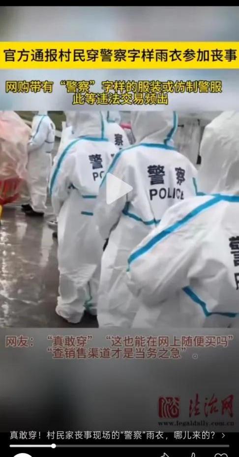 如果你以为只有喜事上会有人乱穿制服就错了。5月的时候云南威信县麟凤镇也出过类似事。龙塘村一个村民左某某家里给他祖母办丧事,结果当天雨太大,他们也想花样整整活,于是从邻居黄某某那借来20件印着“警察”字样的雨衣——这些也是网上买来的。公安机关很快介入,这种和警服长得差不多、又能造成误解的衣服明令禁止,涉嫌违法,就立案查处走流程了。