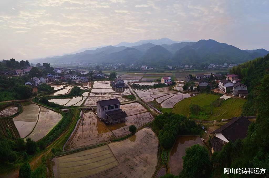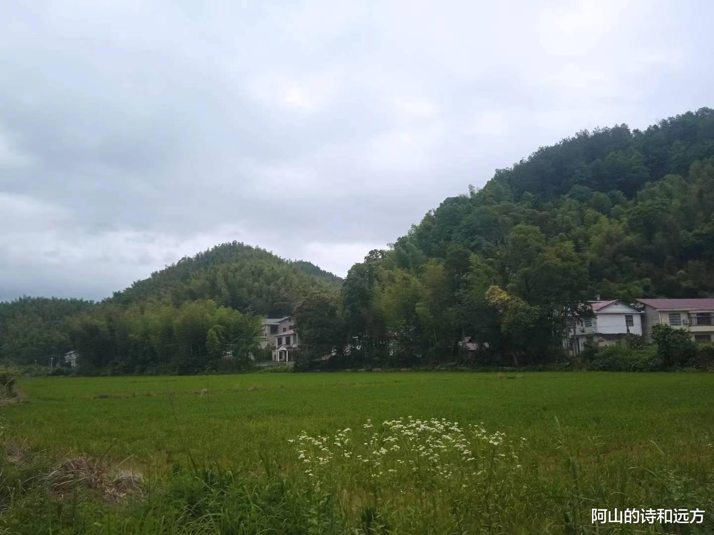 一大片插了稻秧的农田在十多户人家的楼房门口铺展开去。人家的楼房成了这一片田园的点缀。