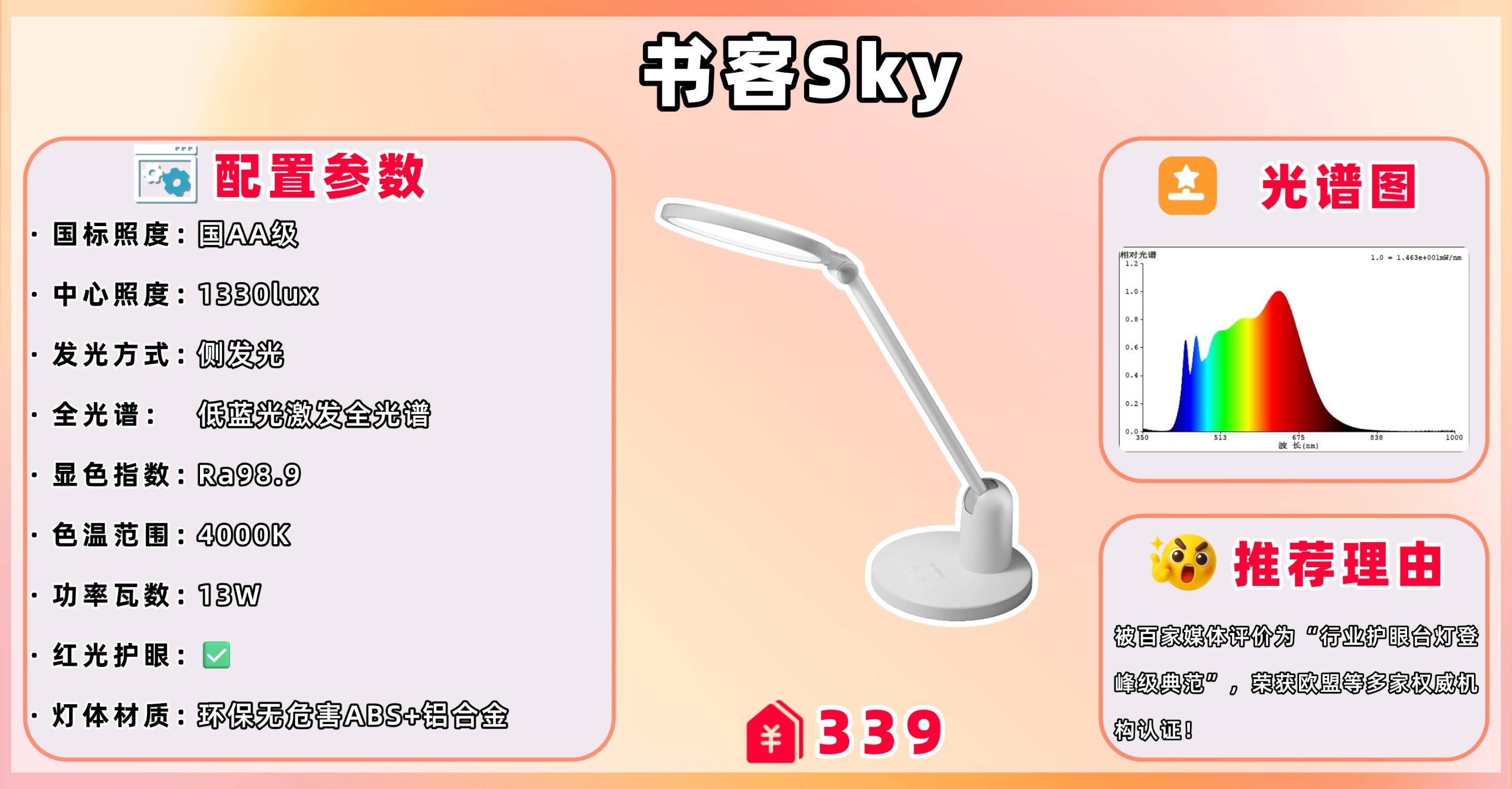 在专业级护眼台灯领域,书客sky堪称“百元档的巅峰之作”。不仅以115%碾压式的全面超越国AA标准,还实现了接近满分的Ra98.9高显色,同时色彩饱和度Rg≥100,并且色彩逼真度Rf≥99,让色彩还原度直逼自然光;严格遵循RG0无蓝光危害标准。人体工学设计支持超大高度自由调节,配合45分钟定时休息模式,真正为青少年的用眼习惯量身定制。无论是配置还是护眼性能,都已全线拉满,被不少行业测评师称为“百元级护眼台灯的天花板”,几乎找不到短板。