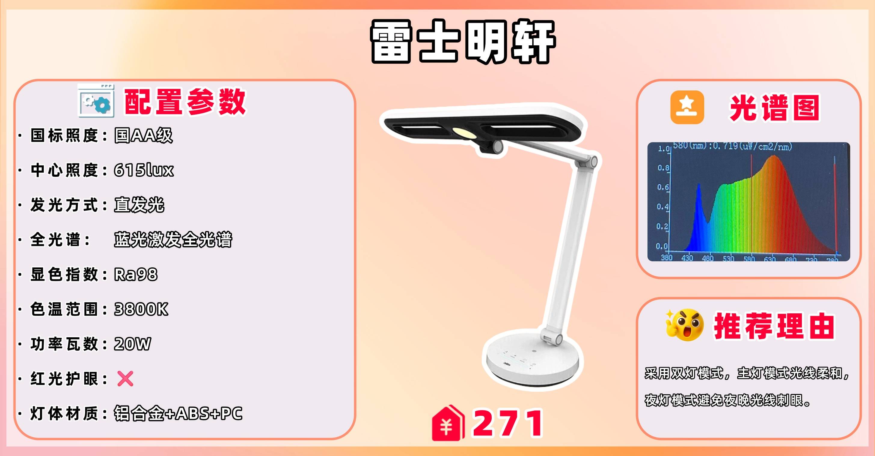 推荐理由:采用了发光面配合微导光扩散技术,光照广阔均匀舒适。