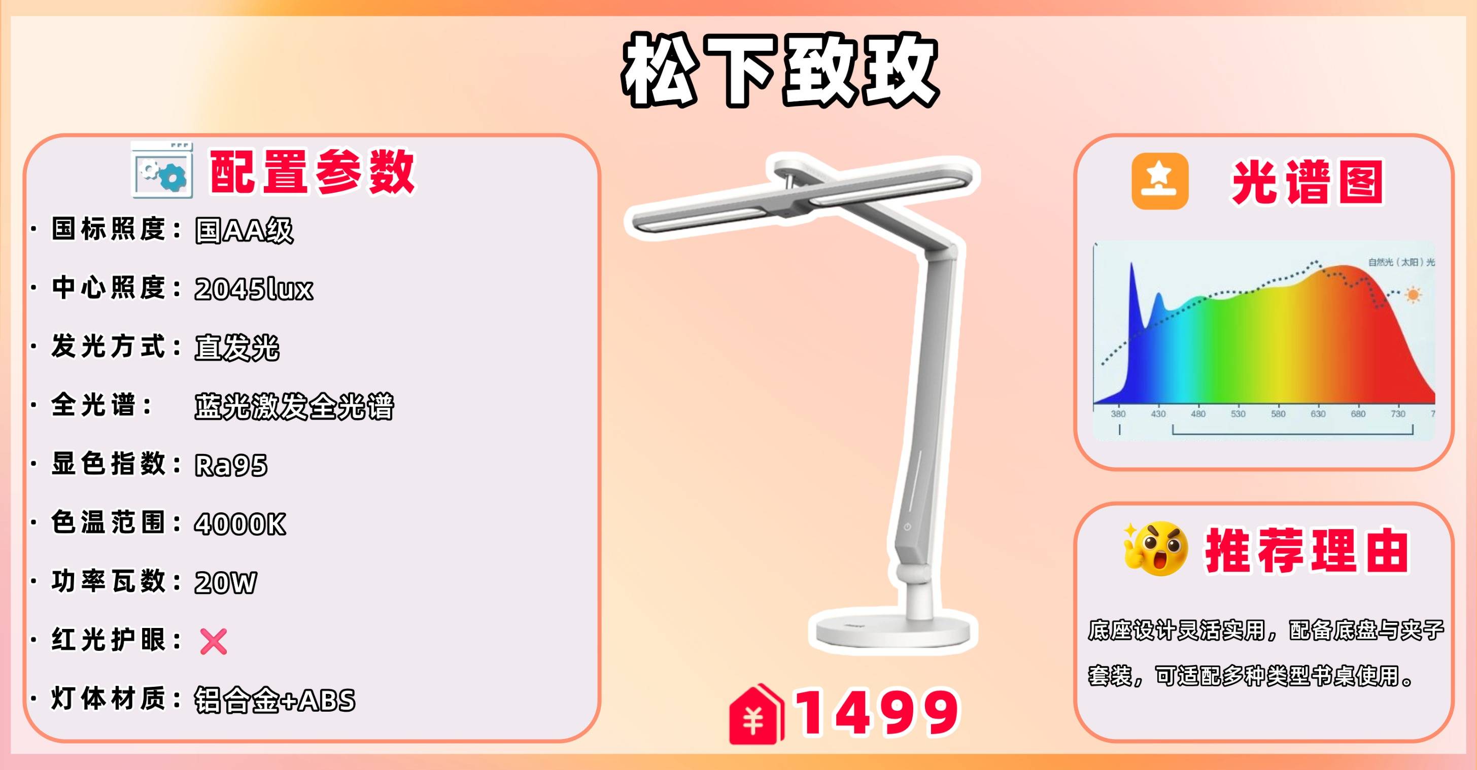 推荐理由:采用底盘+夹子套装底座(夹座需额外购买),适配多类书桌。