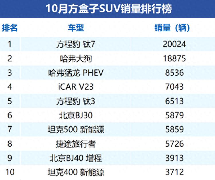 除了上述提到的五款车型外,10月上榜销量前十名的车型还有北京BJ30、坦克500 新能源、捷途旅行者、北京BJ40 增程、坦克400 新能源,这几款车月销量均为突破6000台,但在每款车对应的细分领域下,产品的市场表现已经不算差了。