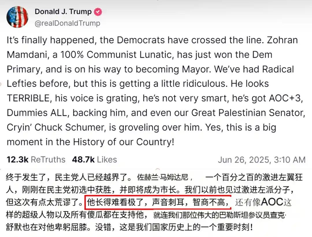 政治对抗的背后逻辑选举进入白热化阶段时,联邦政府突然发声,特朗普在投票前一晚接受媒体采访时警告,如果纽约市交到“极左分子”手中,联邦可能会重新评估资金拨付。