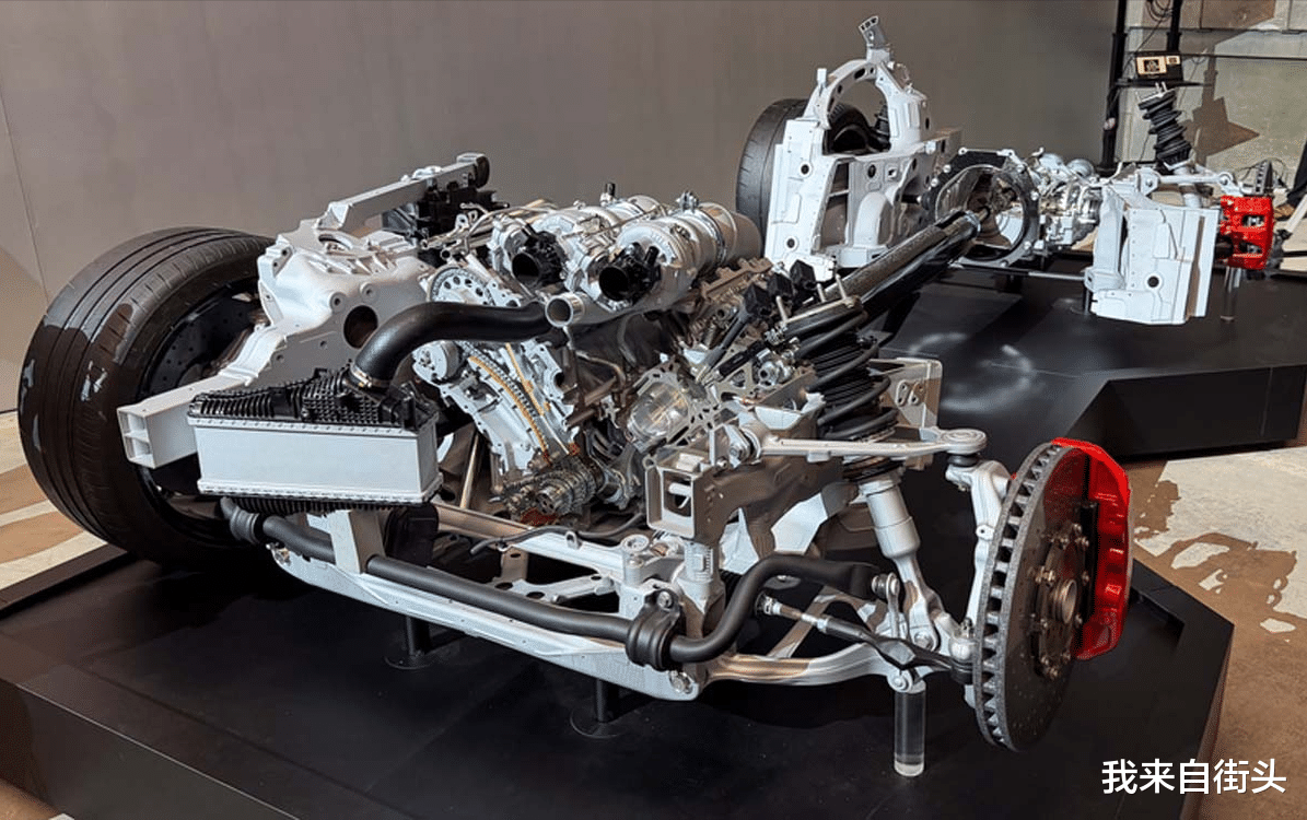 GR GT的动力系统核心,是一具全新开发的4.0L V8双涡轮引擎,采用90度夹角布局,并可看出明显偏向Cross-Plane的结构特征。这具引擎最大的工程亮点之一,在于使用了干式油底壳设计。由于润滑油不需要存放在引擎下方,整具引擎的输出轴可以被安装在极低的位置,使整车重心进一步下探,这对一辆强调操控极限的前中置跑车来说意义重大。