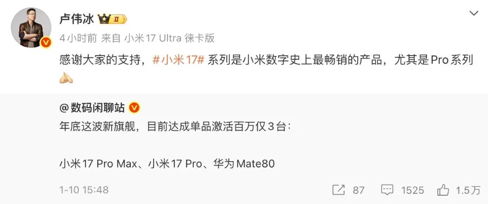今天,卢伟冰转发了这一消息,并表示,“感谢大家的支持,小米17系列是小米数字史上最畅销的产品,尤其是Pro系列”。