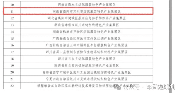 11月20日,工业和信息化部公布第一批“一县一策”中西部纺织服装特色产业集聚区(县域)重点培育名单,邓州市凭借扎实产业基础、完整产业链条和突出发展优势成功入选,标志着其纺织服装产业跻身全国县域特色产业培育梯队,为豫西南产业高质量发展注入强劲动力。