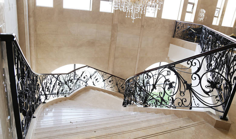 如今铁艺楼梯的梯面多数都是采用精美大理石或者瓷砖铺垫而成的,不仅有着富丽堂皇的外表,也起到良好的安全保障。对比于曾经的木板楼梯,其牢固性不可相提并论,不像木制楼梯那样不平稳,容易坍塌,容易因受潮而腐朽。
