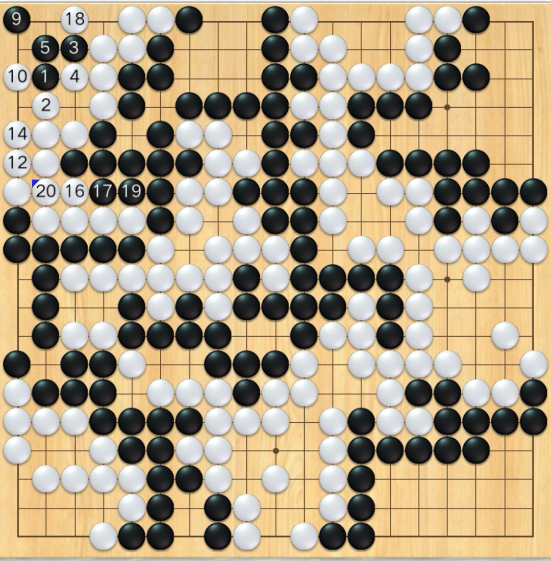 白8多送了一子,错误;要是下在14位提吃,白棋就有一眼,可以有眼杀无眼了,就没有这盘奇局了。但是电脑大概没有见过这棋形啊。