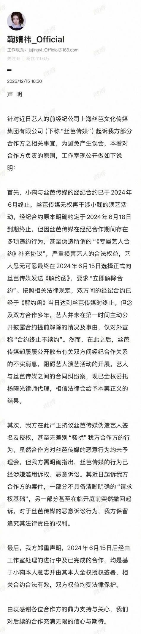 这场静默的核心,是鞠婧祎与丝芭传媒持续一年半的合约博弈。双方的矛盾早在2024年6月就已公开化,核心争议集中在合约期限与收入分配两大焦点。鞠婧祎方明确表示,2013年签订的原合约已于2024年6月年满30周岁时到期,从未签署过延长合约的补充协议,甚至两次提交司法笔迹鉴定,结果均显示“无法判断补充协议签名为鞠婧祎本人所写”,直指公司伪造签名续约。而丝芭传媒则强势反驳,称2018年的补充协议已将商业代理权延长至2033年,还自行委托机构出具“签名真实”的报告,双方各执一词,陷入僵局。